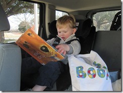 B seemed pretty excited about his first trip to the library…this is him in the car holding his very own library book tote.
