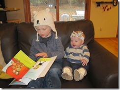 At this point, B appears to be a little more interested in studying than little A…she is just happy to be a part of story time.